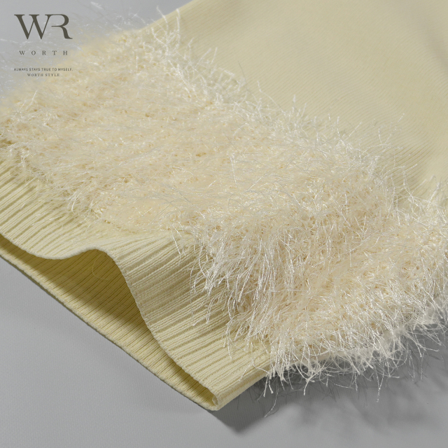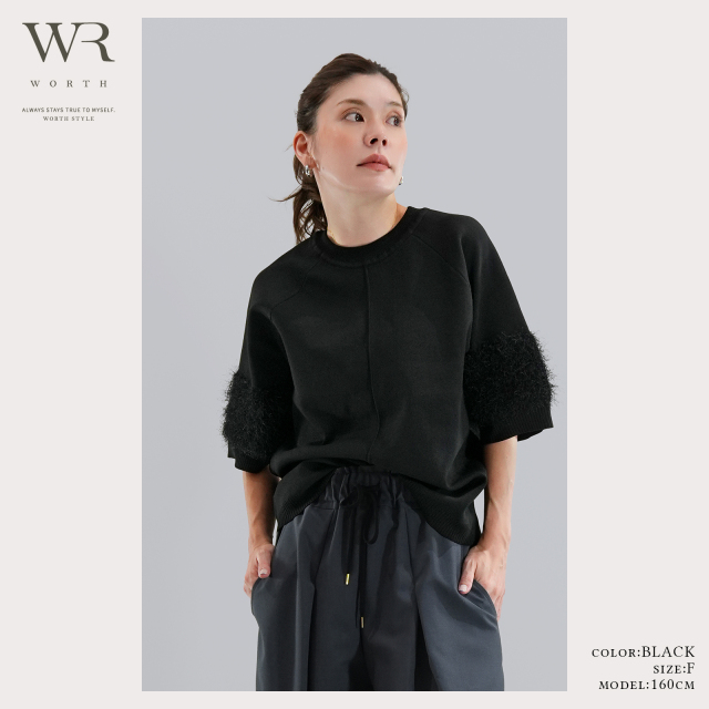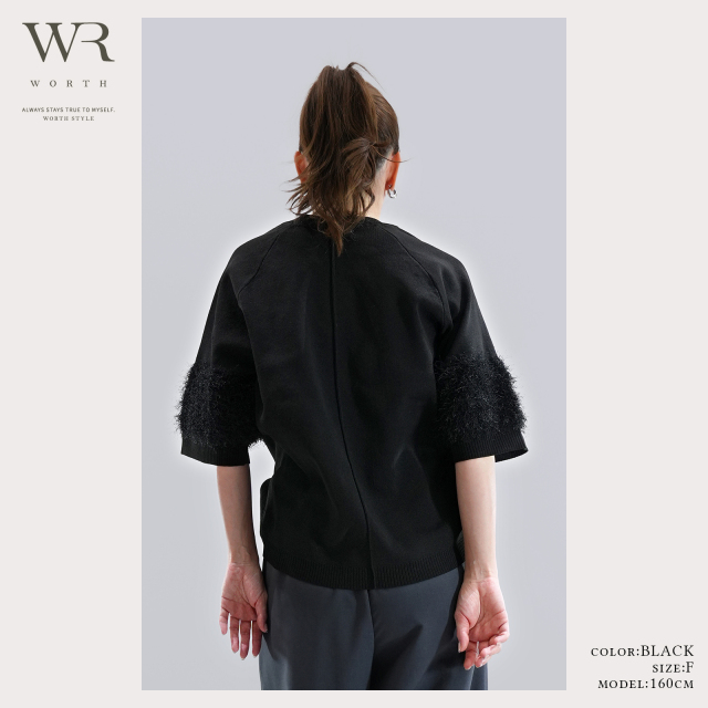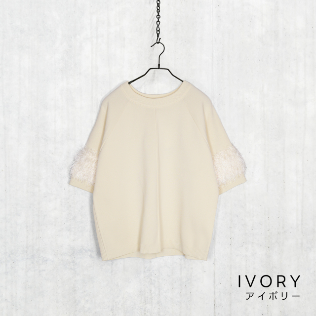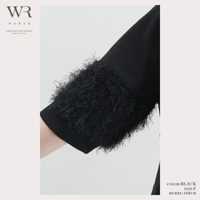 シンプルに見えて、袖部分には同色のシャギー糸をドッキングし表情感のある仕上がりに。