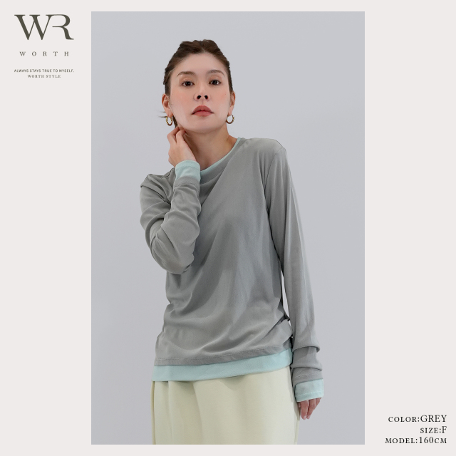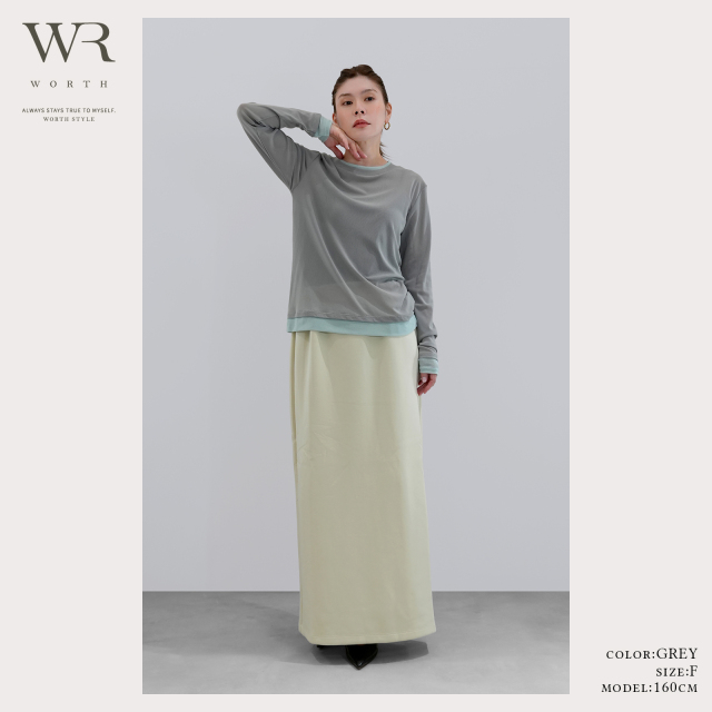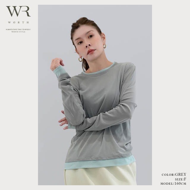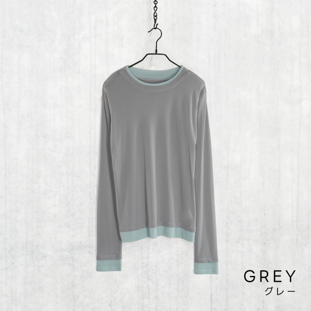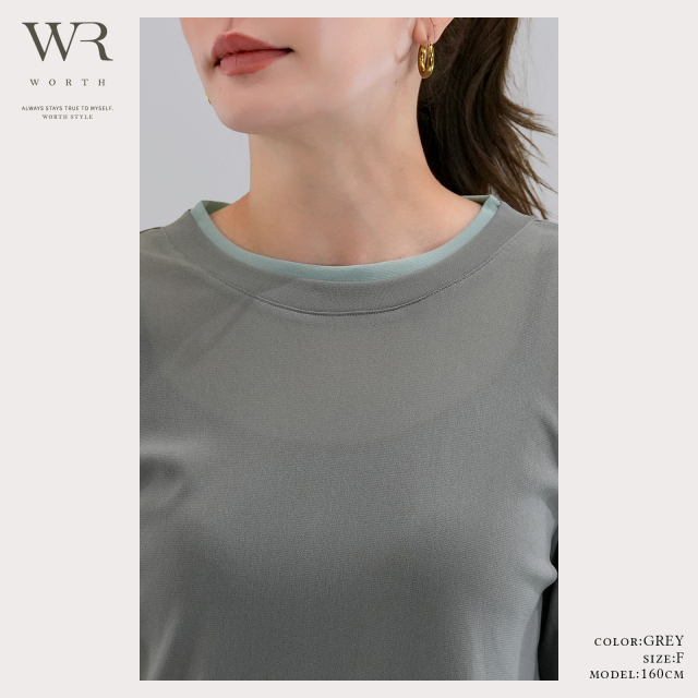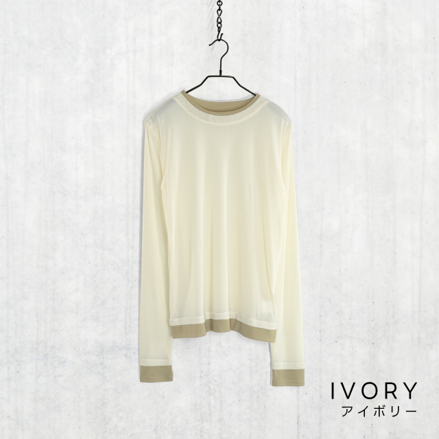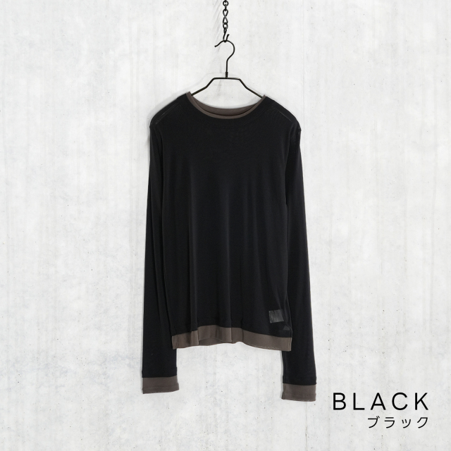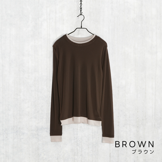 レイヤード風デザインで、重ね着のゴワつきと着膨れを解消。一枚の軽さで、二枚の洒落感を演出します。