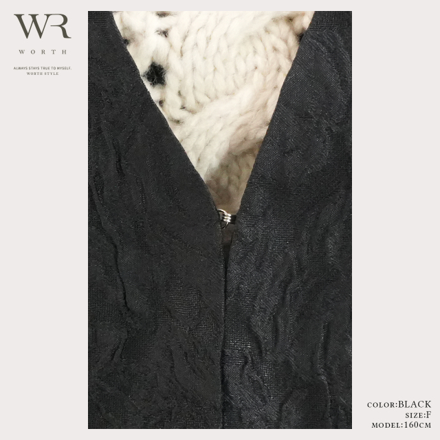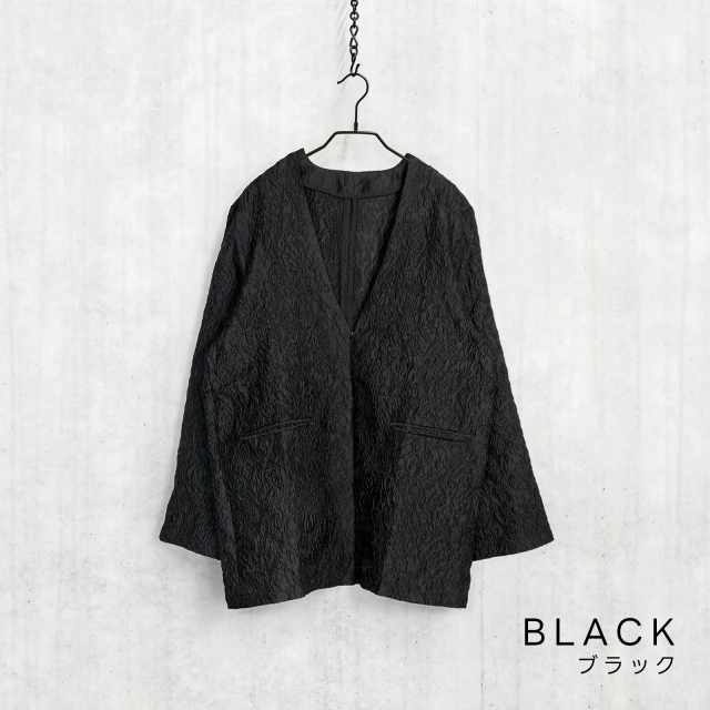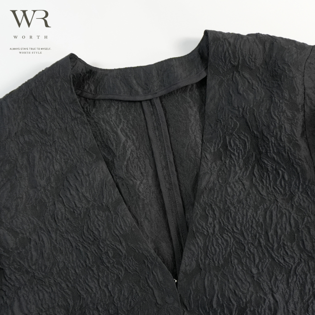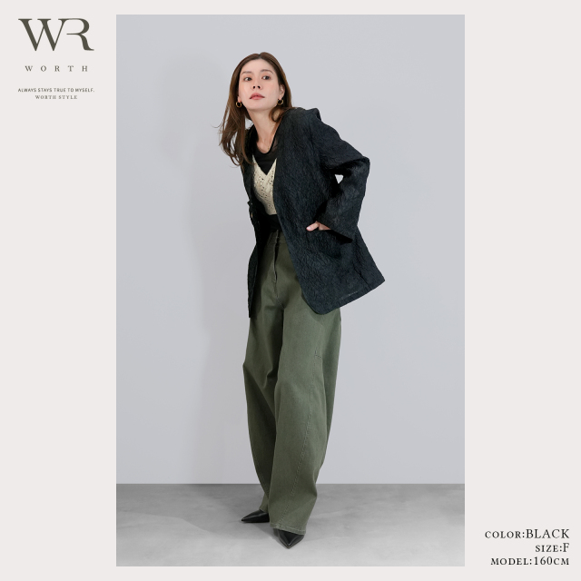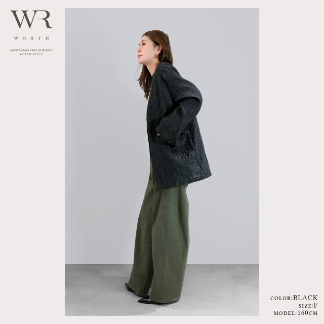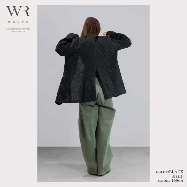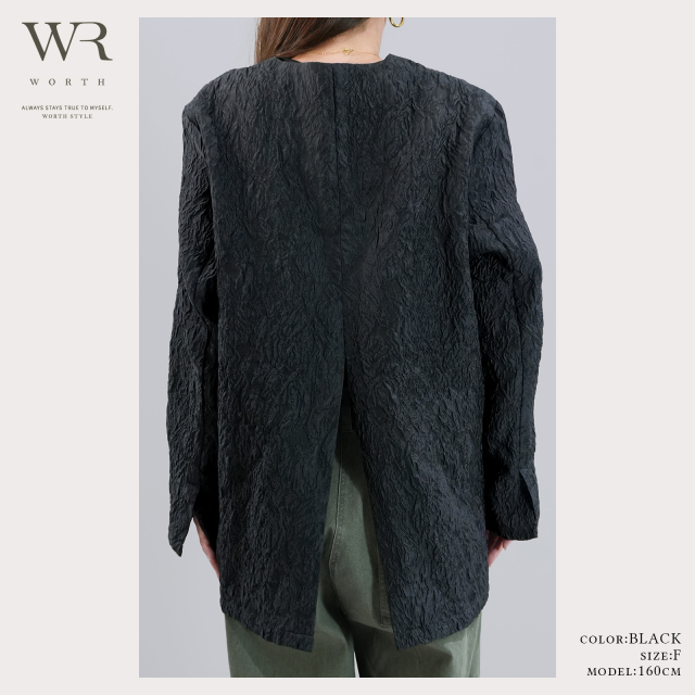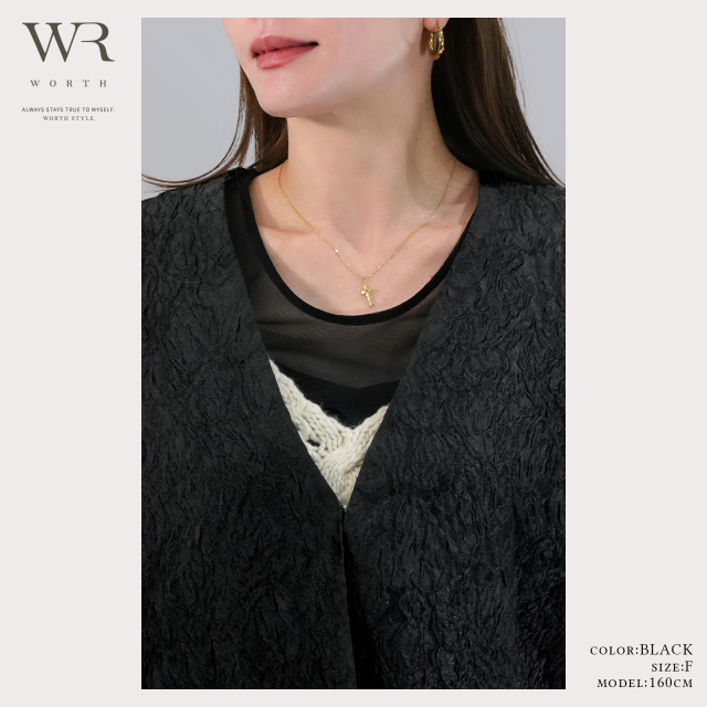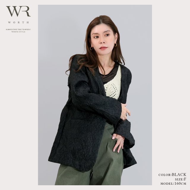 ジャガードの立体感とノーカラーのスッキリ感、重すぎないシアー素材が上品な奥行きとトレンド感を叶えます。