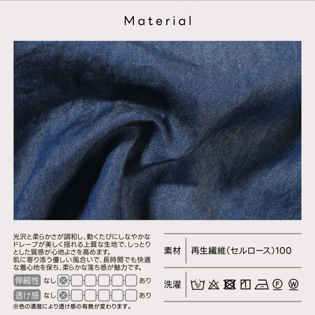 デニムでありながらシルクの様な光沢と柔らかさを持つテンセルが、ごわつきとは無縁のストレスフリーな着心地を実現します。